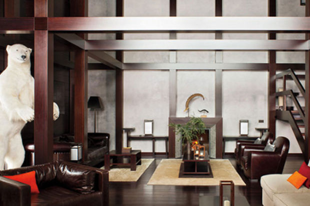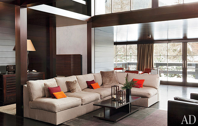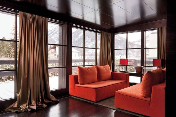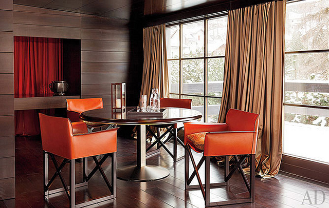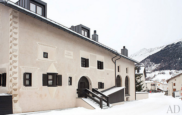 İsviçre’nin Saint Moritz Bölgesi’nde 17.yüzyıldan kalma bir ahırı Modacı ve modacının tasarım ekibi yüksek tavanlı, perdeli cam duvarlarından Alpler’e bakan bir yaşam alanına çevirmişler. Salonda maun ağacından yapılmış kolon ve kirişleri görüyoruz. Aynı şekilde salon duvarında da bu kolon ve kirişlerin birbirlerine geçerek yarattığı duvar kompozisyonu dikkatimizi çekiyor. Zeminlerde maun parke tercih edilmiş ve tüm oturma grupları Armani Casa ürünlerinden seçilmiş, döşemelerinde de ağırlıklı olarak koyu kahverengi deri kaplanmış. Kahverengi tonlarının hakim olduğu mekanda bej rengi kanepe ve açık tonlardaki halı seçimleri ile monotonluk bir parça da olsa kırılmış.