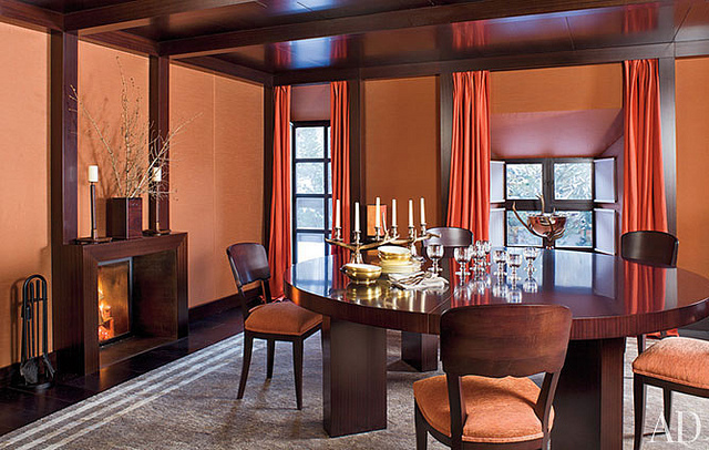 Maun lambri kaplamalı duvarın önünde bronz ayaklı, yuvarlak masa ve turuncu deri döşenmiş yönetmen sandalyesi tarzı sandalyeleri görüyoruz. Turuncu salon genelinde çokça kullanılmış, bu rengi ilerleyen bölümlerinde de görmeye devam edeceğiz. Örneğin yemek bölümüne geldiğimizde buradaki duvarlarda da maun kolon-kiriş hareketlerinin devamını görüyoruz. Yine aynı şekilde duvarda devam eden kolon- kiriş kaplamalar, çerçevesi maun kaplamalı şömine ile birleşiyor. Buradaki duvarlar turuncu tonlarında boyanmışlar ve perde ve sandalye kumaşlarında yine turuncu tercih edilmiş. Zeminler, duvar kaplamaları, yemek masası ve sandalyelerde maun ağacı, halıda ise bej rengi kullanılmış. Bunların dışında en yoğun renk yine turuncu olmuş.