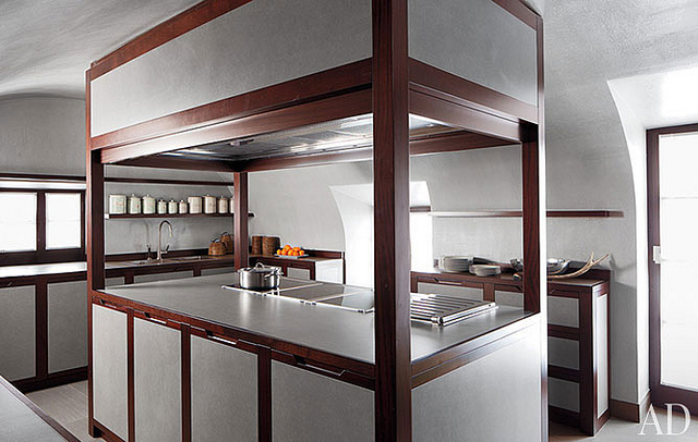 Salondaki renk, kumaş ve ahşap hareketliliğine tezat olarak mutfağın sadeliği hatta basitliği beni şaşırttı. O kadar turuncuya baktıktan sonra, yoğun perde kumaşlarından sonra mutfak bana son derece sade geldi ve neden acaba diye düşünmeden edemedim. Molteni firması ile birlikte tasarlamışlar. Maun kaplama ile beyaz renk kullanılmış, oldukça küçük bir mutfak. Mutfağın tavan yüksekliği de gördüğüm kadarıyla az olduğu için tezgah üzerlerine dolaplar yapılamamış, bu da boş ve basit görüntüye sebebiyet vermiş olabilir.