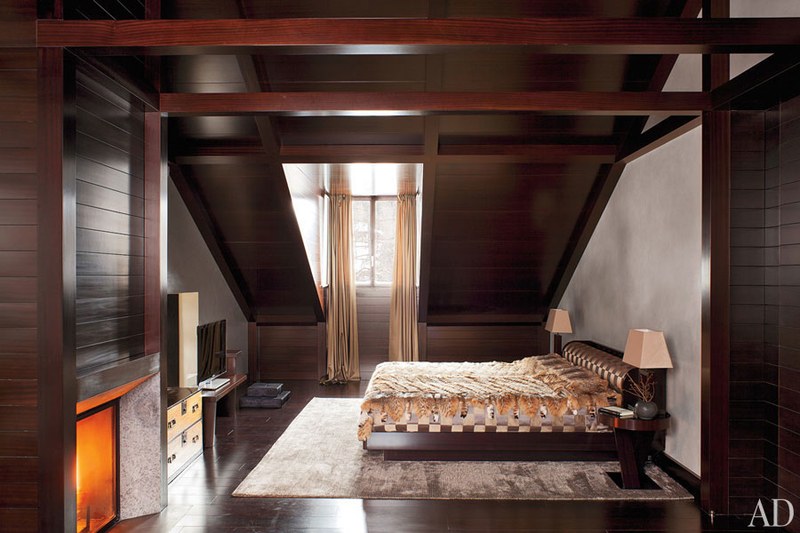 Ebeveyn yatak odası çatı katında bulunuyor. Zeminler, tavanlar ve duvarların bir bölümünde maun kullanılmış. Maun kolon-kiriş detayları alt katın devamı olarak burada da karşımıza çıkıyor Yatak Armani Casa ürünü ve maun kaplama; yatak başında kahverengi deri kullanılmış, yatak örtüsü sarı tonlarında kürk kumaştan yapılmış. Halı yine Armani Casa ürünü ve bej rengi tonlarında, şömine çerçevesinde bej tonlarında mermer ve etrafında da maun lambriler görüyoruz. Sade, modern aynı zamanda renk ve ahşap tercihinden dolayı şık bir atmosfer yaratılmış. Aslında alt katta ne görüyorsak evin genelinde aynı ambians devam ediyor, şaşırdığımız tek şey şu ana kadar sadece mutfak oldu.