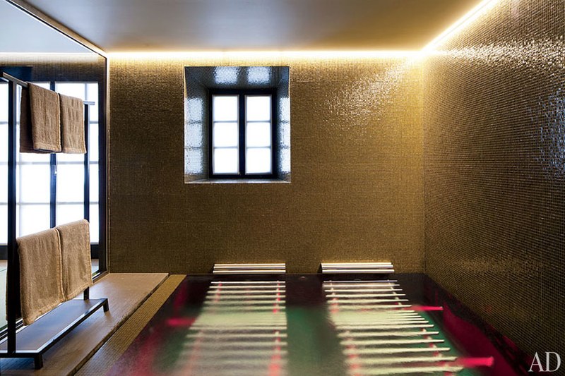 SPA bölümüne geldiğimizde içinden renkli ışıkların verildiği küçük bir havuz gözümüze çarpıyor. Duvarları altın renginde mozaiklerle kaplanmış ve bu mozaiklere tavandan gizli ışık verilmiş. Böylece parıldayan, egzotik esintileri hissettiren bir ortam hazırlanmış. Bu ortam içinde demir profillerle yapılmış sade ve modern havluluk dikkatimizi çekiyor. Altın rengi, ışıldayan mozaiklerin arasında özellikle bu kadar sadeliğin tercih edilmesini doğru buluyorum yoksa ortam modern havasından çıkabilirdi. Bu arada havluluğun da Armani Casa ürünü olduğunu belirteyim.